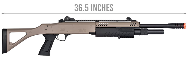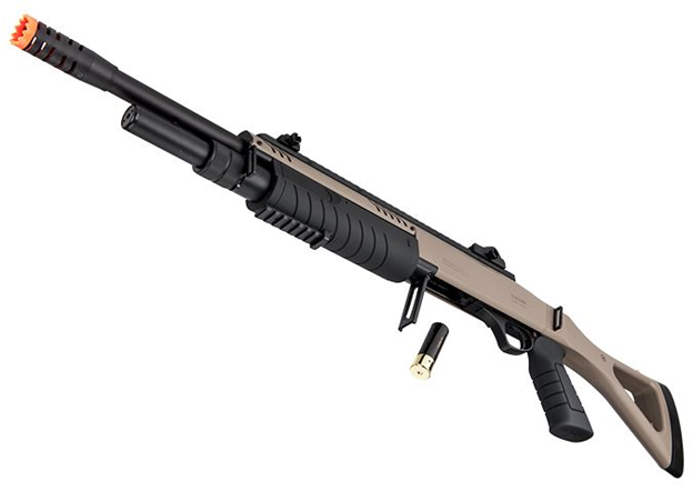 The FABARM STF/12 Long Barrel Shotgun w/ Fixed Stock in Dark Earth and Black delivers a perfect blend of realism, durability, and performance for airsoft players who demand authenticity in their loadout. Officially licensed by FABARM, this spring-powered shotgun is built with a rugged polymer body and barrel assembly that keeps the weight down without sacrificing strength. Measuring 36 inches in overall length and weighing just 4 pounds, it strikes an excellent balance of size and maneuverability, making it a versatile option for both outdoor skirmishes and indoor CQB matches. Firing at 300 to 310 FPS with 0.20g BBs, this pump-action shotgun offers reliable performance, while its 30-round shell-style magazine enhances the immersive experience. Each shot fires in a tri-shot spread pattern, closely mimicking the behavior of a real shotgun and giving players a tactical advantage in close-range scenarios.