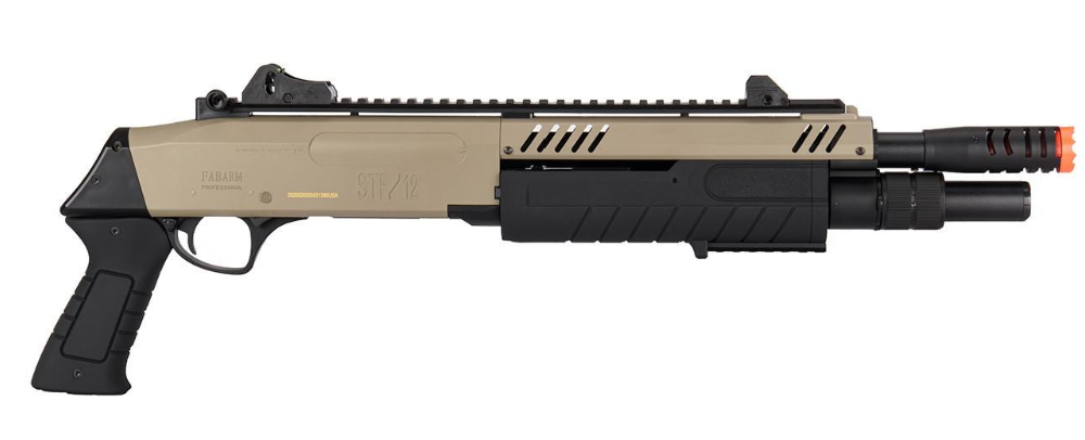 The airsoft shotgun achieves a consistent velocity of 300-310 FPS (using 0.20g BBs), making it perfect for indoor fields. Measuring just 610mm in length, the compact design uses a lightweight Polymer body and barrel assembly. This keeps the weight at a manageable 1,265g for fast handling and maneuvering. The STF/12 uses a realistic Pump action firing mode, feeding directly from 30-Round shells. Crucially, this airsoft shotgun offers high utility due to its broad Magazine Compatibility, fitting standard Tokyo Marui airsoft shotgun shell magazines. Finished in a tactical Tan/Black two-tone color, the FABARM STF/12 provides a unique aesthetic combined with the rugged dependability expected from officially licensed products. For a reliable, powerful, and maneuverable close-range weapon, this Fabarm/BO Manufacture airsoft shotgun is a top contender. SPECIFICATIONS: