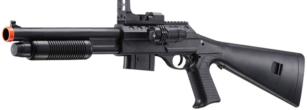 The UK Arms Pump Action Shotgun with scope and light in black is a lightweight, affordable, and fun airsoft shotgun designed for casual players and beginners. Built from durable ABS plastic, this spring-powered shotgun offers a balance of strength and maneuverability while keeping the weight at just 3 lbs for easy handling. Measuring 30 inches in length, it features a realistic pump-action mechanism that mimics the feel of a traditional shotgun, making it both engaging and simple to operate. Shooting at around 300 FPS with 0.12g BBs, this shotgun provides solid backyard plinking performance and is well-suited for close-quarter airsoft games. The internal reservoir magazine holds up to 100 rounds, giving players plenty of shots before needing to reload, which is perfect for extended skirmishes or casual target shooting. Designed with usability in mind, the UK Arms Pump Action Airsoft Shotgun includes features that enhance comfort and gameplay. A stubby stock keeps the profile compact, making it ideal for maneuvering in tight CQB environments, while grooved finger holes in the pistol grip ensure a secure hold even when wearing gloves. The included scope and flashlight add to the realism and tactical appearance of the shotgun while also improving target acquisition in low-light situations. With its straightforward single-shot operation, players of all experience levels can quickly pick up and enjoy the action. Whether you are looking for an entry-level airsoft shotgun, a reliable springer for casual matches, or simply a fun and affordable option for target shooting, the UK Arms Pump Action Shotgun with scope and light delivers solid performance, easy handling, and an authentic pump-action experience straight out of the box. Specifications:
